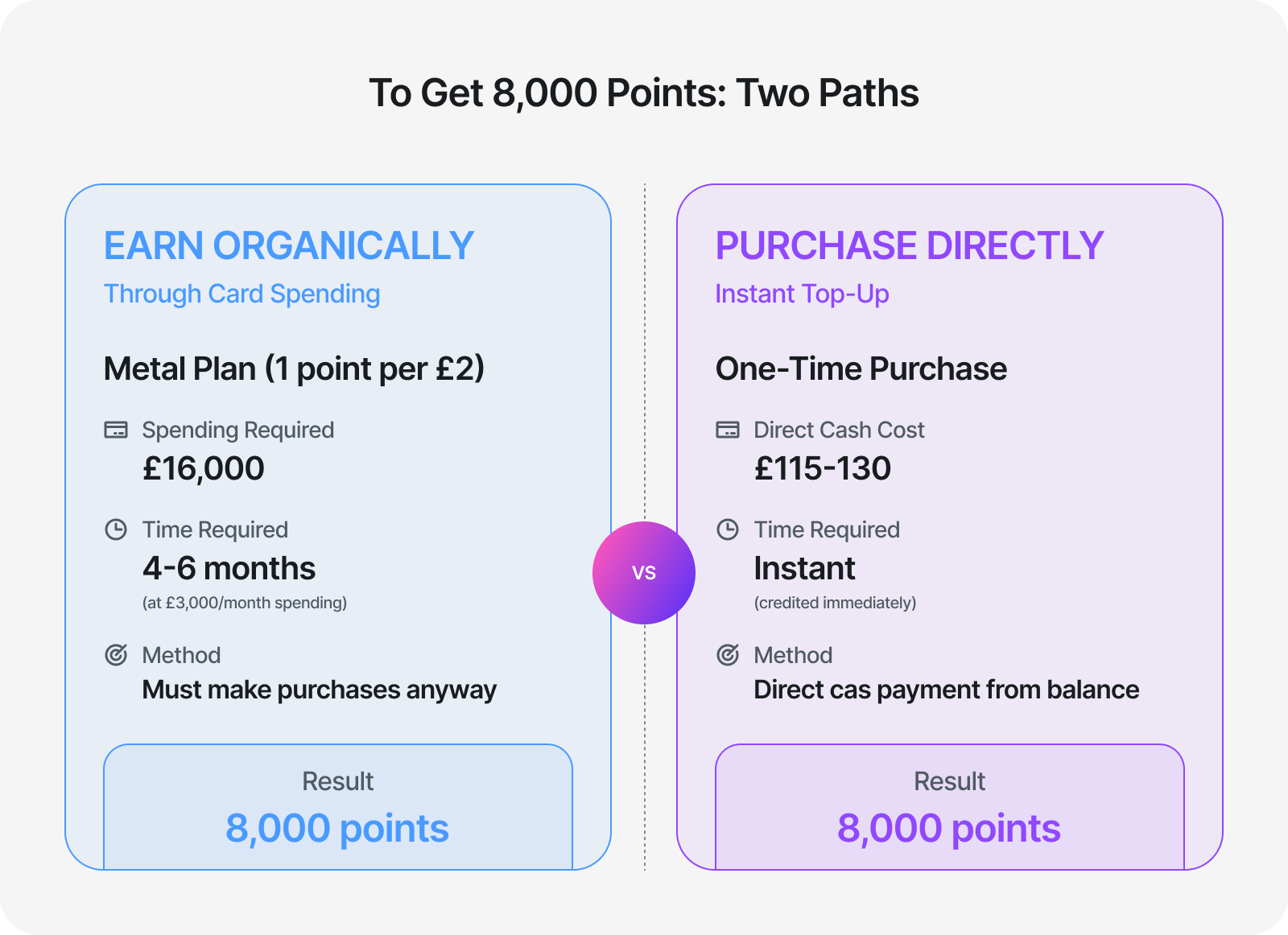 Compare this against earning those 8,000 points organically. On a Metal plan (1 point per £2), you'd need £16,000 in additional spending — which you may not make for months. The purchase shortcut makes sense when the redemption value significantly exceeds purchase cost plus taxes.